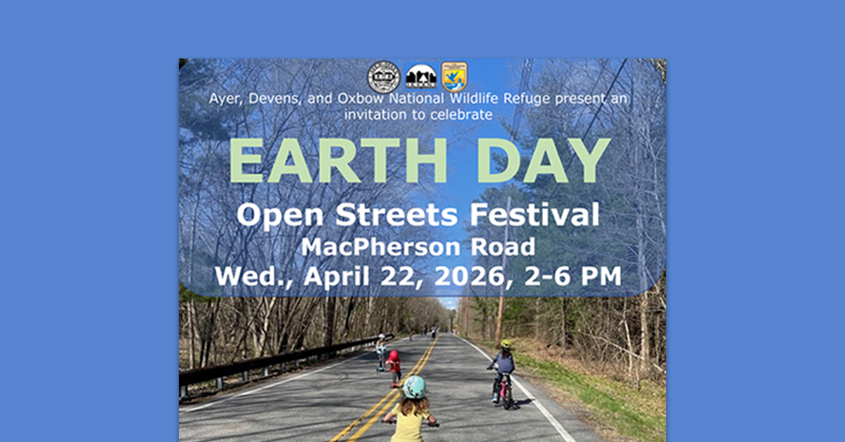 Whether you run, bike, hike, roll, scoot, or stroll this is your dedicated, safe space for Earth Day play in a beautiful natural area! Ayer, Devens, and the Oxbow National Wildlife Refuge will again host the Open Street and Greenway Earth Day Event on Wednesday, April 22nd, from 2pm-6pm on MacPherson Road. This will be the 5th annual open streets event, celebrating Earth Day by opening the streets to people for recreational activities and the opportunity to experience the beautiful Wild and Scenic Nashua River and Oxbow National Wildlife Refuge in a safe and peaceful manner.