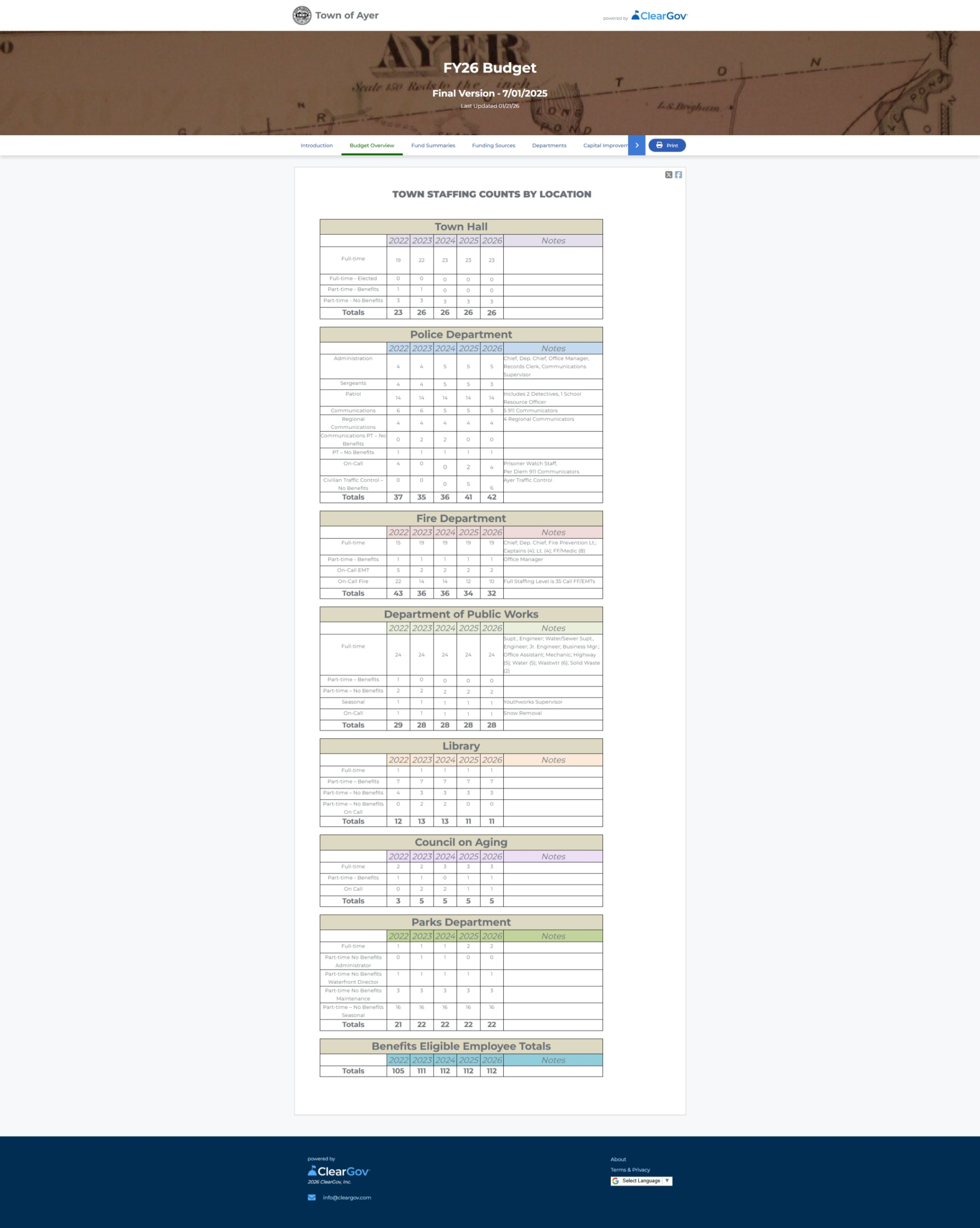 According to the budget book, the Town of Ayer has 112 benefits eligible employees for the FY2026 budget process (the current year). We checked as of Feb. 18th and the website shows the budget book was last updated on Jan. 21, 2026.